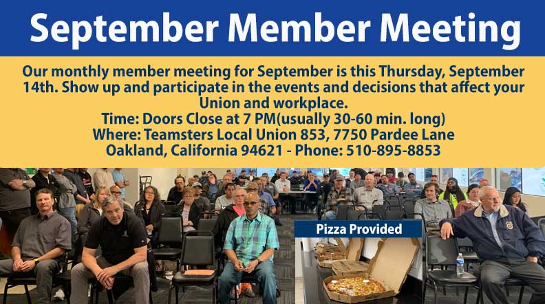Our monthly member meeting for September is this Thursday, September 14th. Show up and participate in the events and decisions that affect your Union and workplace.